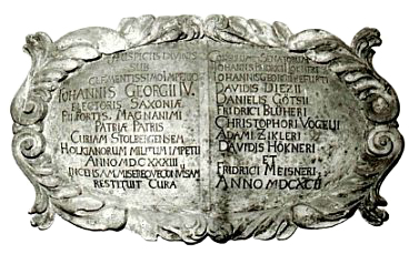 "Mit göttlicher Gnade unter der allermildesten Herrschaft Johann Georg IV. Churfürst von Sachsen des Frommen, Tapferen, Großmütigen, des Vaters des Vaterlandes, hat das Stollberger Rathaus, welches beim Einfall der Hölkschen Krieger verbrannt und elendiglich zerstört worden war, die Fürsorge der Bürgermeister und Ratsmänner Johann Friedrich Hökner, Johann Georg Trefurt, David Dietze, Daniel Göthe, Friedrich Blüher, Christoph Vogel, Adam Zickler, David Hökner und Friedrich Meißner wieder hergestellt.